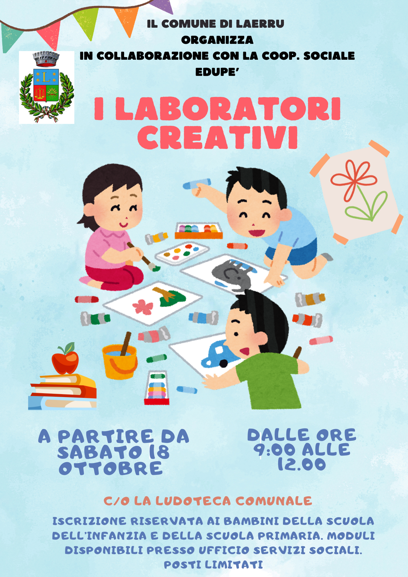 I Laboratori, curati dalla Cooperativa Sociale Edupè, si terranno nei locali della Ludoteca comunale, a partire da sabato 18 Ottobre, dalle ore 9.00 alle ore 12.00.
