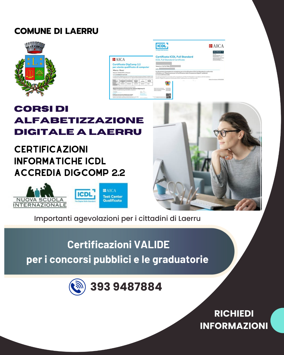 Il Comune di Laerru, grazie alla sottoscrizione di un protocollo d'Intesa con la Nuova Scuola Internazionale, darà la possibilità a tutti i cittadini residenti di acquisire o migliorare le competenze nel campo informatico. 💻🖥️ e di Attestare tali competenze con la CERTIFICAZIONE ICDL ACCREDIA valida come Certificazione di Alfabetizzazione Digitale (C.I.A.D.) ormai sempre più importante per graduatorie e concorsi, usufreundo dei corsi a prezzi agevolati.